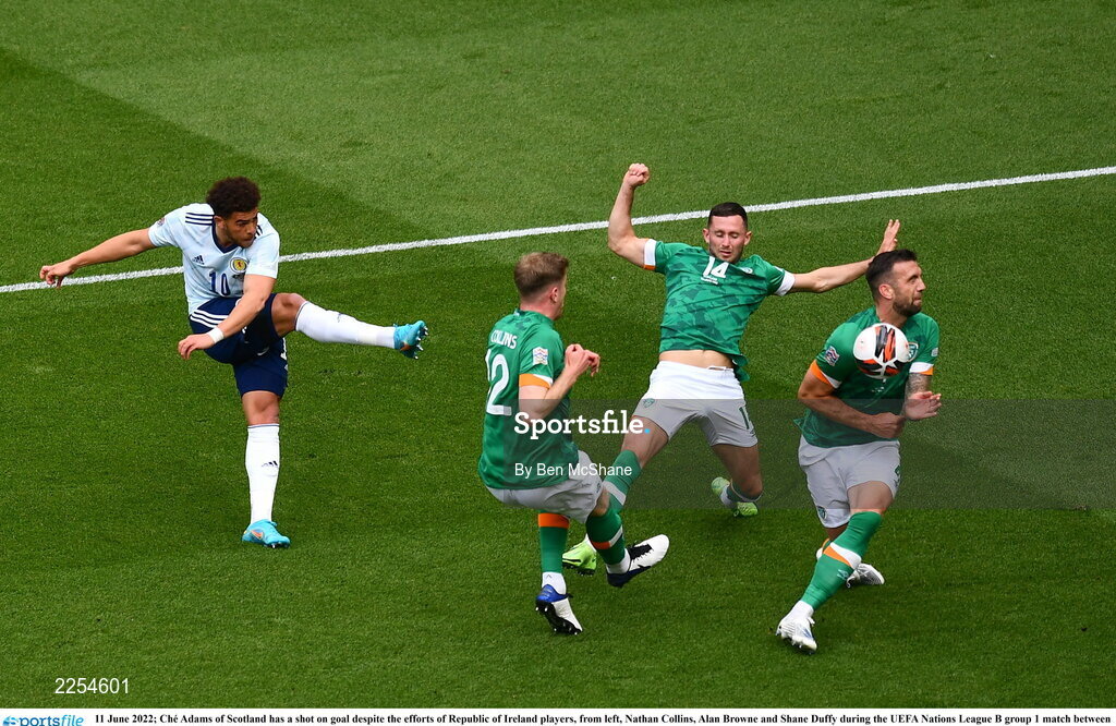 11 June 2022; Ché Adams of Scotland has a shot on goal despite the efforts of Republic of Ireland players, from left, Nathan Collins, Alan Browne and Shane Duffy during the UEFA Nations League B group 1 match between Republic of Ireland and Scotland at the Aviva Stadium in Dublin. Photo by Ben McShane/Sportsfile