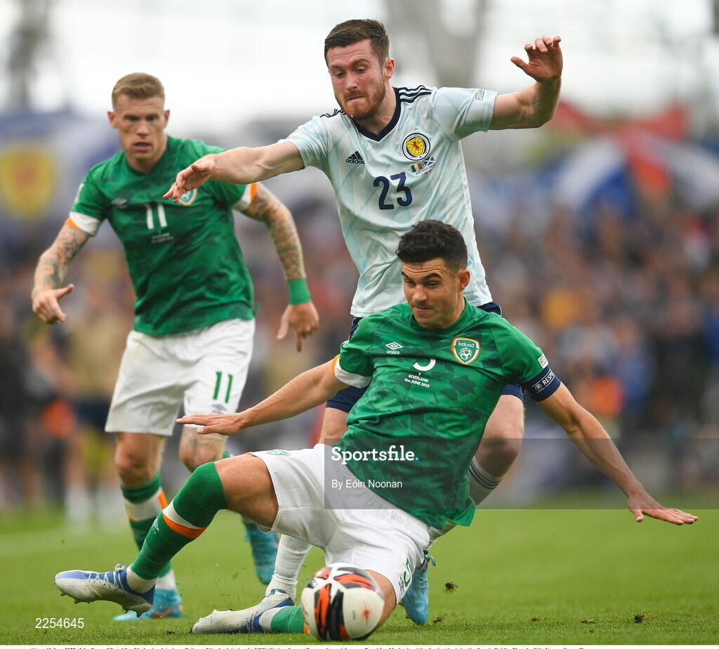 11 June 2022; John Egan of Republic of Ireland and Anthony Ralston of Scotland during the UEFA Nations League B group 1 match between Republic of Ireland and Scotland at the Aviva Stadium in Dublin. Photo by Eóin Noonan/Sportsfile