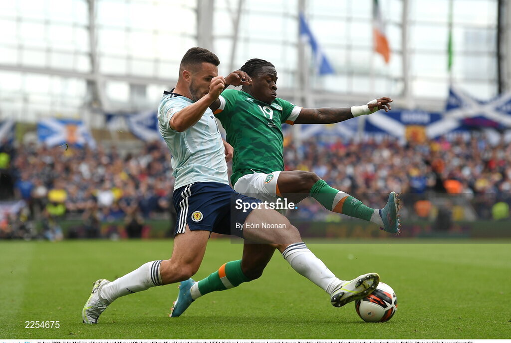 11 June 2022; John McGinn of Scotland and Michael Obafemi of Republic of Ireland during the UEFA Nations League B group 1 match between Republic of Ireland and Scotland at the Aviva Stadium in Dublin. Photo by Eóin Noonan/Sportsfile