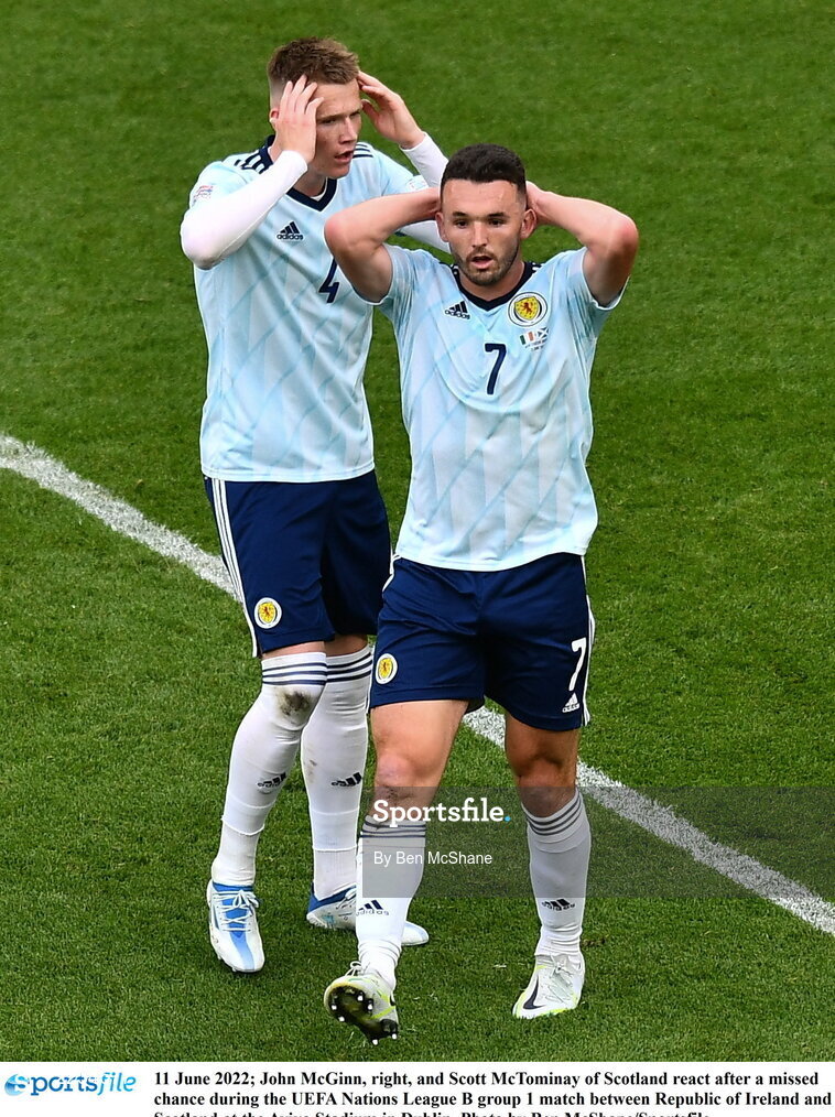 11 June 2022; John McGinn, right, and Scott McTominay of Scotland react after a missed chance during the UEFA Nations League B group 1 match between Republic of Ireland and Scotland at the Aviva Stadium in Dublin. Photo by Ben McShane/Sportsfile