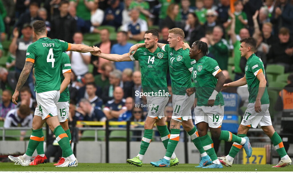 11 June 2022; Alan Browne of Republic of Ireland, 14, celebrates with teammates after scoring their side's first goal during the UEFA Nations League B group 1 match between Republic of Ireland and Scotland at the Aviva Stadium in Dublin. Photo by Seb Daly/Sportsfile