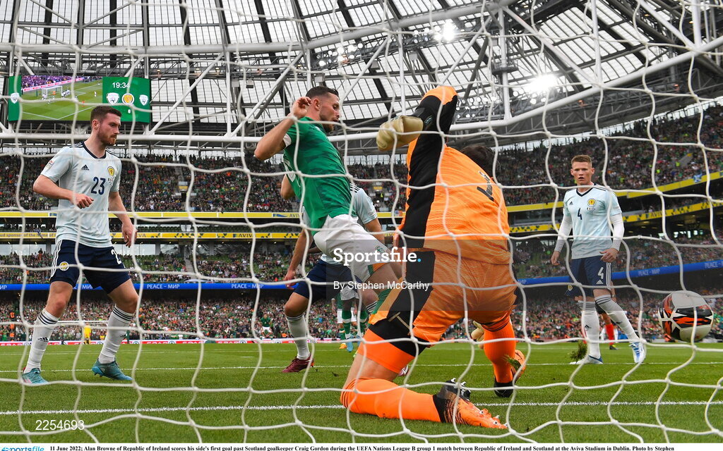 11 June 2022; Alan Browne of Republic of Ireland scores his side's first goal past Scotland goalkeeper Craig Gordon during the UEFA Nations League B group 1 match between Republic of Ireland and Scotland at the Aviva Stadium in Dublin. Photo by Stephen McCarthy/Sportsfile