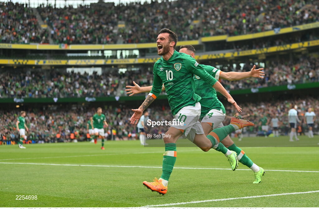 11 June 2022; Troy Parrott of Republic of Ireland celebrates after scoring his side's second goal during the UEFA Nations League B group 1 match between Republic of Ireland and Scotland at the Aviva Stadium in Dublin. Photo by Seb Daly/Sportsfile