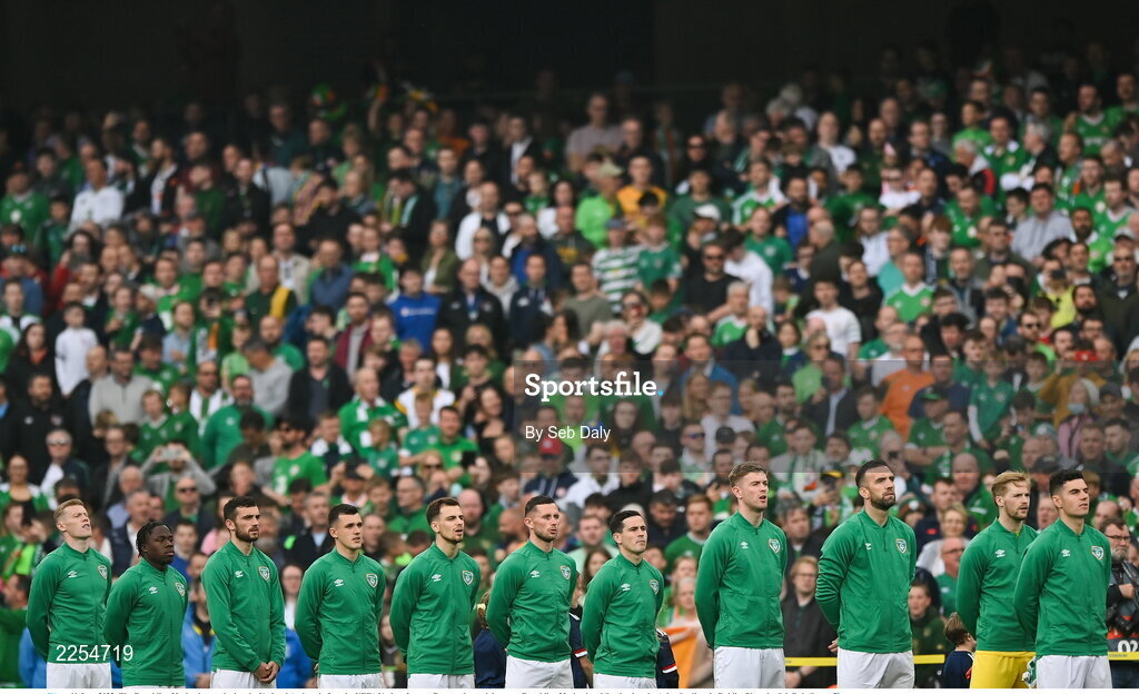 11 June 2022; The Republic of Ireland team during the National Anthem before the UEFA Nations League B group 1 match between Republic of Ireland and Scotland at the Aviva Stadium in Dublin. Photo by Seb Daly/Sportsfile