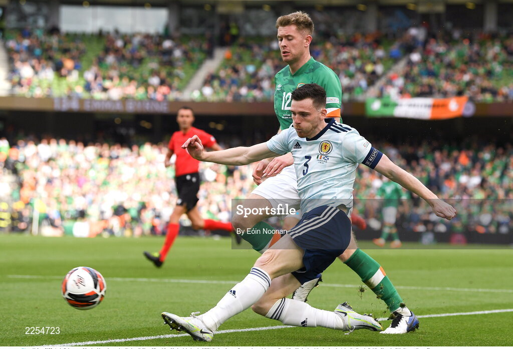 11 June 2022; Andy Robertson of Scotland in action against Nathan Collins of Republic of Ireland during the UEFA Nations League B group 1 match between Republic of Ireland and Scotland at the Aviva Stadium in Dublin. Photo by Eóin Noonan/Sportsfile