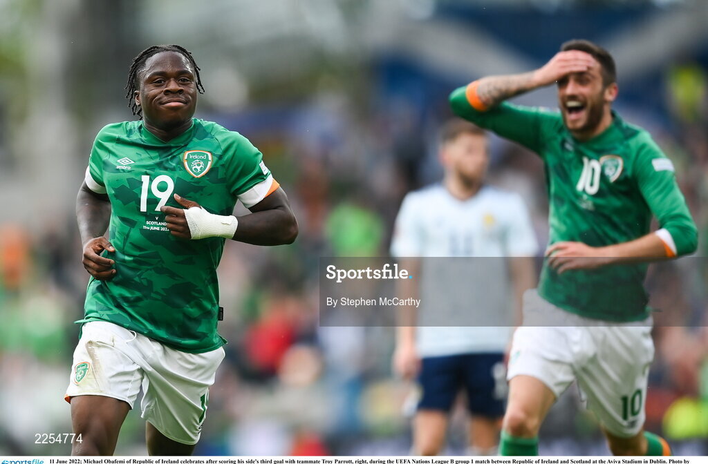 11 June 2022; Michael Obafemi of Republic of Ireland celebrates after scoring his side's third goal with teammate Troy Parrott, right, during the UEFA Nations League B group 1 match between Republic of Ireland and Scotland at the Aviva Stadium in Dublin. Photo by Stephen McCarthy/Sportsfile