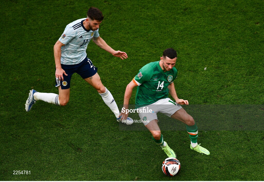 11 June 2022; Alan Browne of Republic of Ireland and Ryan Christie of Scotland during the UEFA Nations League B group 1 match between Republic of Ireland and Scotland at the Aviva Stadium in Dublin. Photo by Ben McShane/Sportsfile