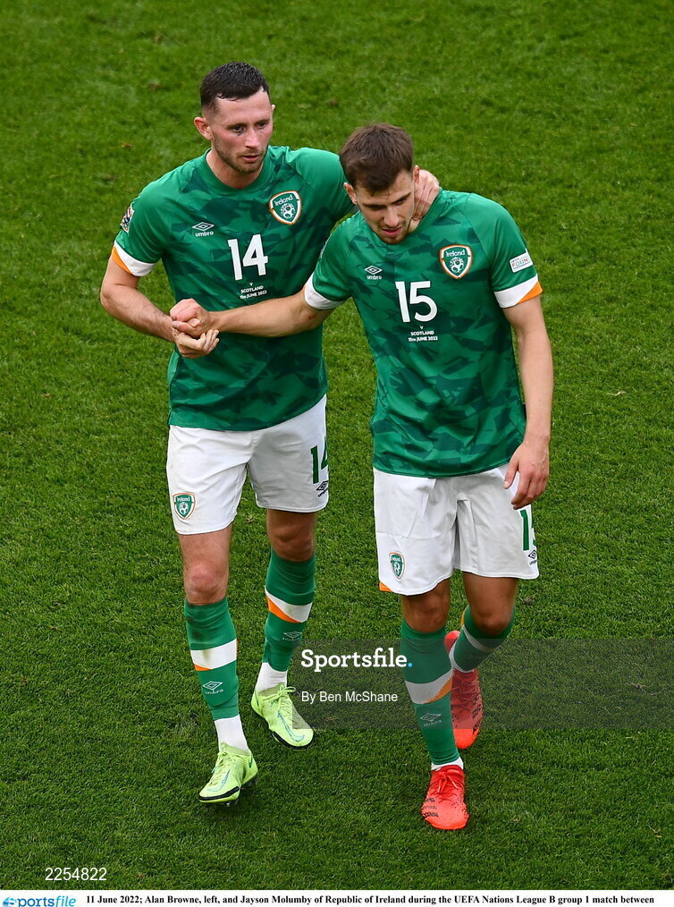 11 June 2022; Alan Browne, left, and Jayson Molumby of Republic of Ireland during the UEFA Nations League B group 1 match between Republic of Ireland and Scotland at the Aviva Stadium in Dublin. Photo by Ben McShane/Sportsfile