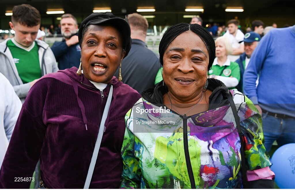 11 June 2022; The family of Michael Obafemi of Republic of Ireland, sister Omolabake Oredein, left, and mother Bolajoko Oredein, after the UEFA Nations League B group 1 match between Republic of Ireland and Scotland at the Aviva Stadium in Dublin. Photo by Stephen McCarthy/Sportsfile