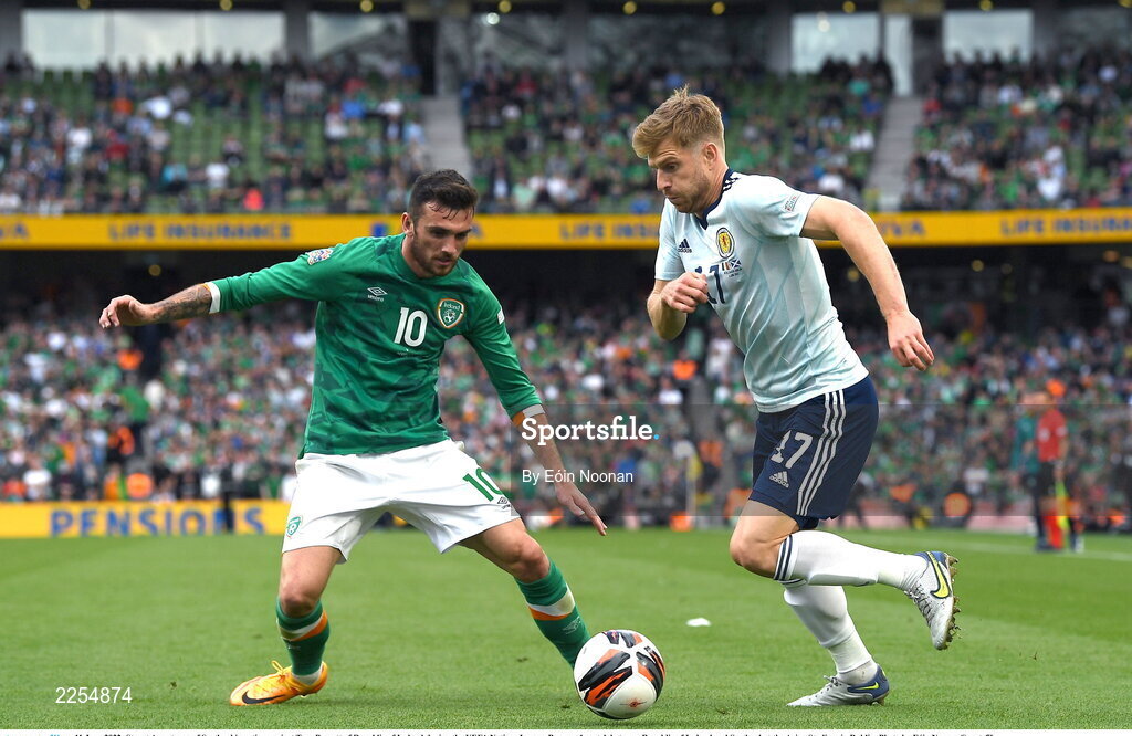 11 June 2022; Stuart Armstrong of Scotland in action against Troy Parrott of Republic of Ireland during the UEFA Nations League B group 1 match between Republic of Ireland and Scotland at the Aviva Stadium in Dublin. Photo by Eóin Noonan/Sportsfile