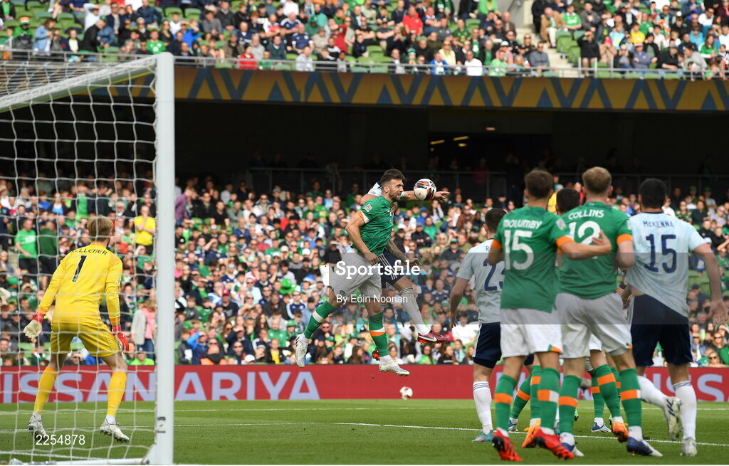 11 June 2022; Shane Duffy of Republic of Ireland in action against Grant Hanley of Scotland during the UEFA Nations League B group 1 match between Republic of Ireland and Scotland at the Aviva Stadium in Dublin. Photo by Eóin Noonan/Sportsfile