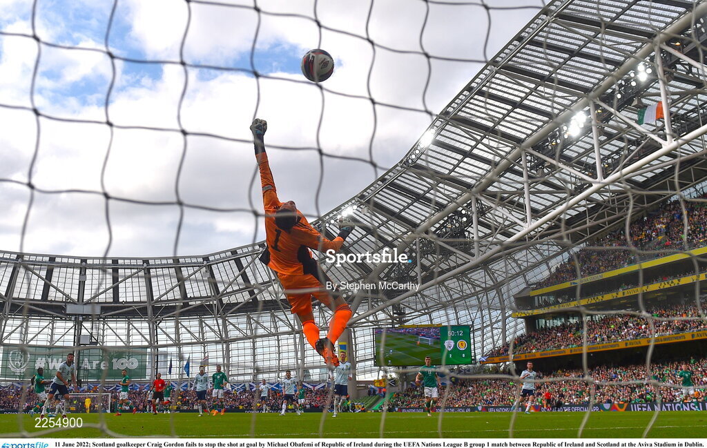 11 June 2022; Scotland goalkeeper Craig Gordon fails to stop the shot at goal by Michael Obafemi of Republic of Ireland during the UEFA Nations League B group 1 match between Republic of Ireland and Scotland at the Aviva Stadium in Dublin. Photo by Stephen McCarthy/Sportsfile