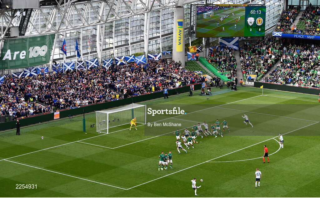 11 June 2022; Billy Gilmour of Scotland takes a free kick during the UEFA Nations League B group 1 match between Republic of Ireland and Scotland at the Aviva Stadium in Dublin. Photo by Ben McShane/Sportsfile