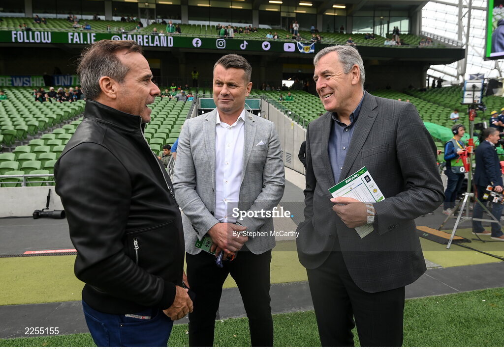 11 June 2022; RTÉ's Peter Collins, left, with former Republic of Ireland goalkeepers Shay Given and Packie Bonner, right, before the UEFA Nations League B group 1 match between Republic of Ireland and Scotland at the Aviva Stadium in Dublin. Photo by Stephen McCarthy/Sportsfile
