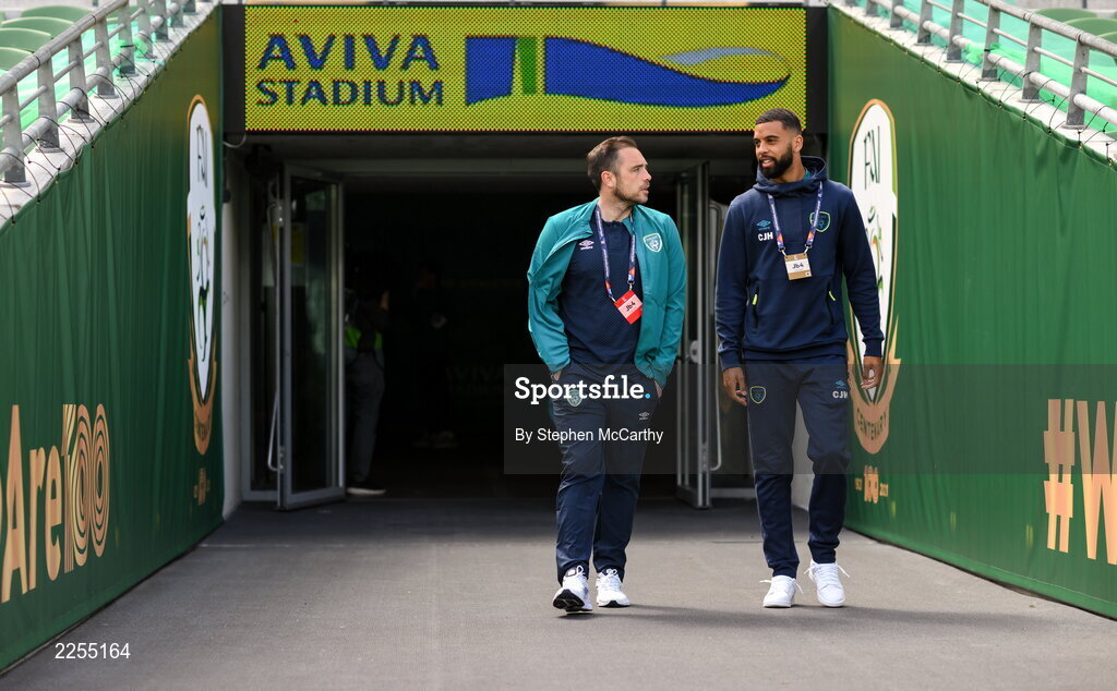 11 June 2022; Republic of Ireland coach Stephen Rice and CJ Hamilton, right, before the UEFA Nations League B group 1 match between Republic of Ireland and Scotland at the Aviva Stadium in Dublin. Photo by Stephen McCarthy/Sportsfile