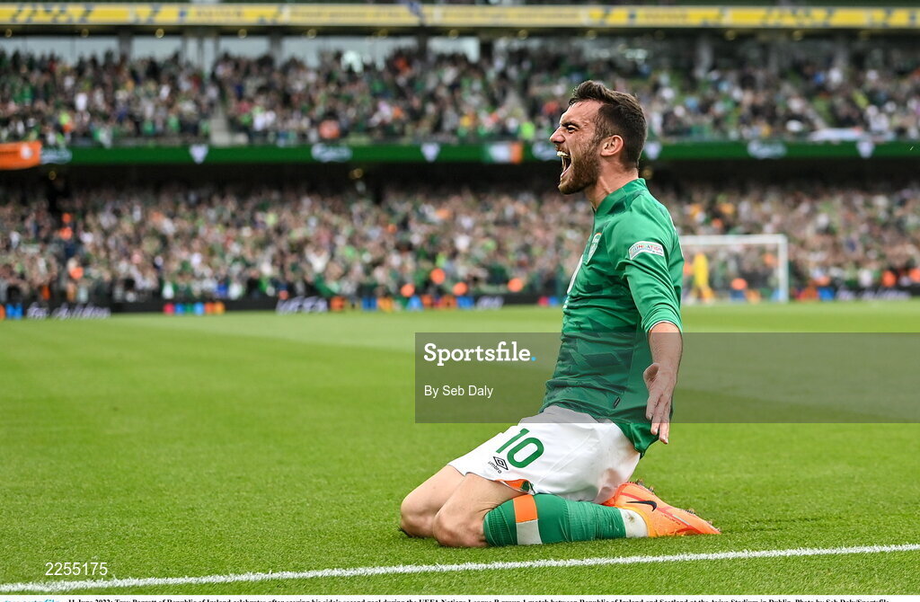 11 June 2022; Troy Parrott of Republic of Ireland celebrates after scoring his side's second goal during the UEFA Nations League B group 1 match between Republic of Ireland and Scotland at the Aviva Stadium in Dublin. Photo by Seb Daly/Sportsfile
