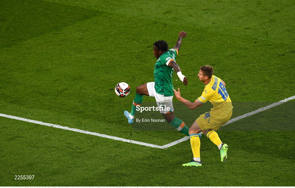 8 June 2022; Michael Obafemi of Republic of Ireland in action against Valeriy Bondar of Ukraine during the UEFA Nations League B group 1 match between Republic of Ireland and Ukraine at Aviva Stadium in Dublin. Photo by Eóin Noonan/Sportsfile