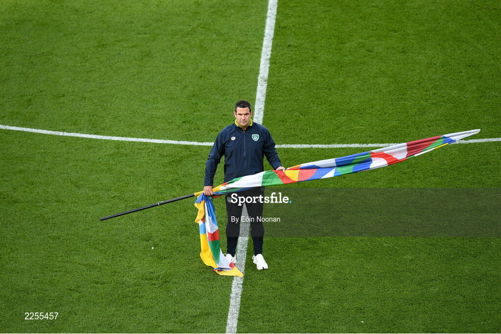 8 June 2022; Nations League flag bearer before the UEFA Nations League B group 1 match between Republic of Ireland and Ukraine at Aviva Stadium in Dublin. Photo by Eóin Noonan/Sportsfile
