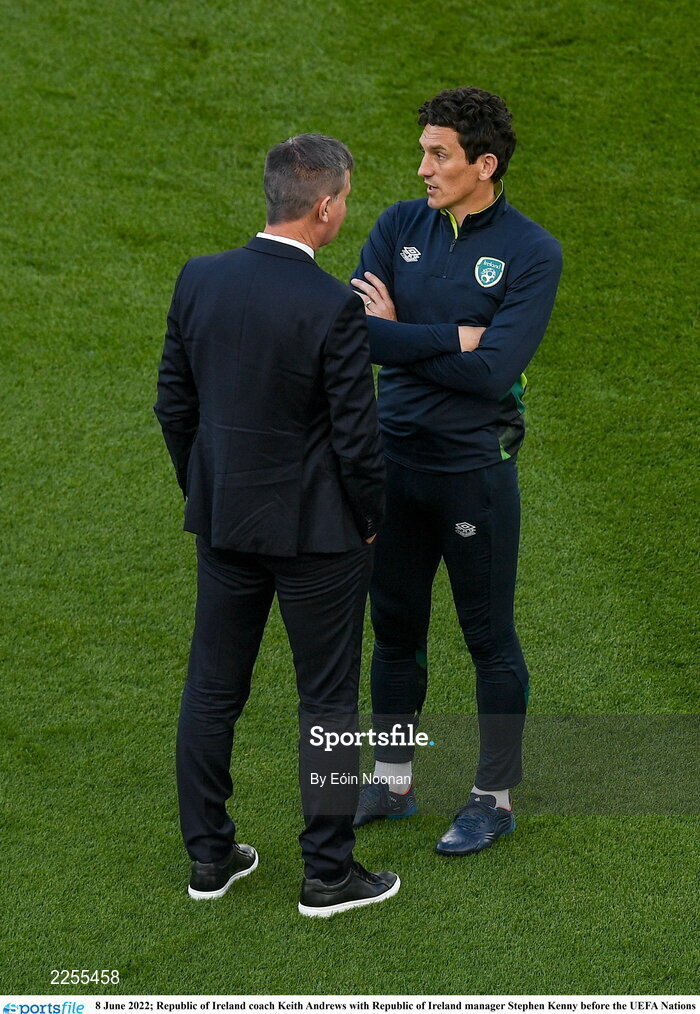 8 June 2022; Republic of Ireland coach Keith Andrews with Republic of Ireland manager Stephen Kenny before the UEFA Nations League B group 1 match between Republic of Ireland and Ukraine at Aviva Stadium in Dublin. Photo by Eóin Noonan/Sportsfile