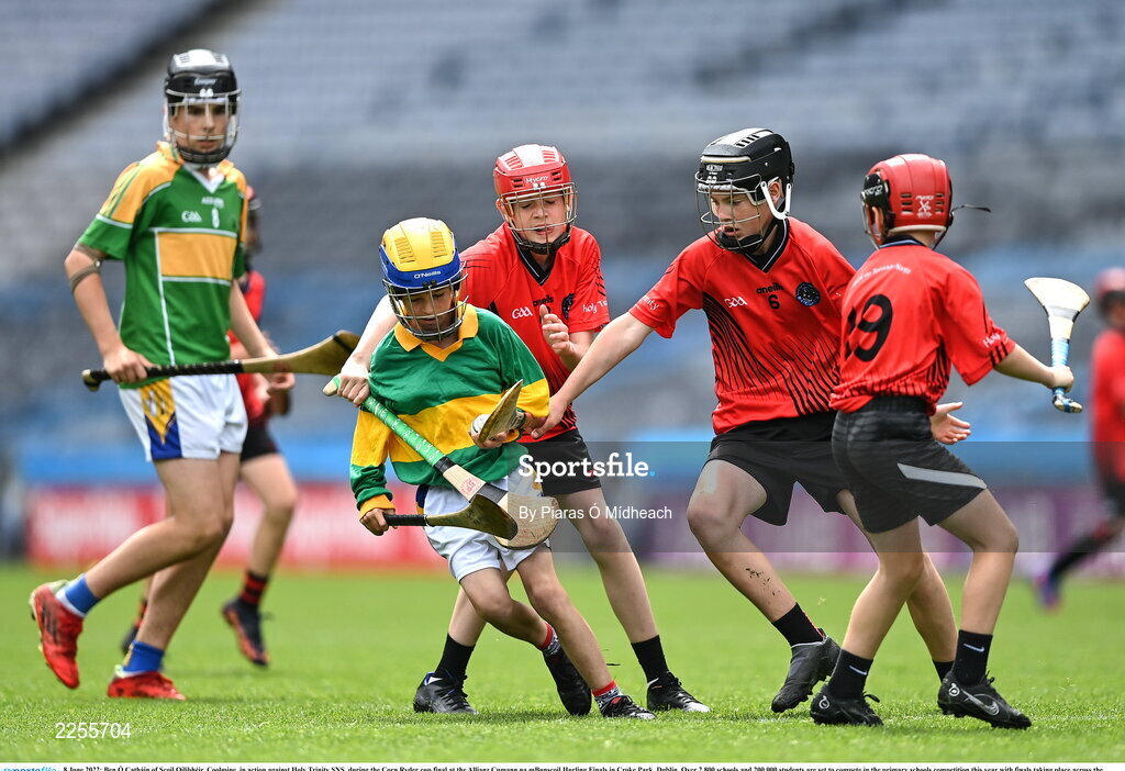 8 June 2022; Ben Ó Catháin of Scoil Oilibhéir, Coolmine, in action against Holy Trinity SNS, during the Corn Ryder cup final at the Allianz Cumann na mBunscoil Hurling Finals in Croke Park, Dublin. Over 2,800 schools and 200,000 students are set to compete in the primary schools competition this year with finals taking place across the country. Allianz and Cumann na mBunscol are also gifting 500 footballs, 200 hurleys and 200 sliotars to schools across the country to welcome Ukrainian students into our national games and local communities. Photo by Piaras Ó Mídheach/Sportsfile