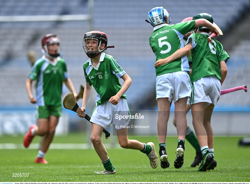 8 June 2022; Aidan Ó Mórdha of Scoil Naithí, 10, celebrates after his side's victory over Scoil Treasa, Firhouse, in the Corn Sean O Rinn final during the Allianz Cumann na mBunscoil Hurling Finals in Croke Park, Dublin. Over 2,800 schools and 200,000 students are set to compete in the primary schools competition this year with finals taking place across the country. Allianz and Cumann na mBunscol are also gifting 500 footballs, 200 hurleys and 200 sliotars to schools across the country to welcome Ukrainian students into our national games and local communities. Photo by Piaras Ó Mídheach/Sportsfile