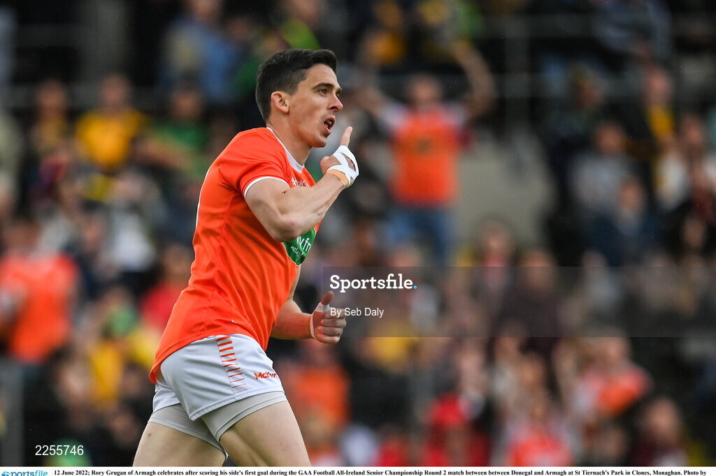 12 June 2022; Rory Grugan of Armagh celebrates after scoring his side's first goal during the GAA Football All-Ireland Senior Championship Round 2 match between between Donegal and Armagh at St Tiernach's Park in Clones, Monaghan. Photo by Seb Daly/Sportsfile