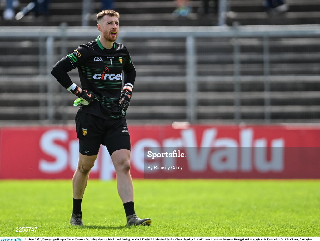 12 June 2022; Donegal goalkeeper Shaun Patton after being shown a black card during the GAA Football All-Ireland Senior Championship Round 2 match between between Donegal and Armagh at St Tiernach's Park in Clones, Monaghan. Photo by Ramsey Cardy/Sportsfile