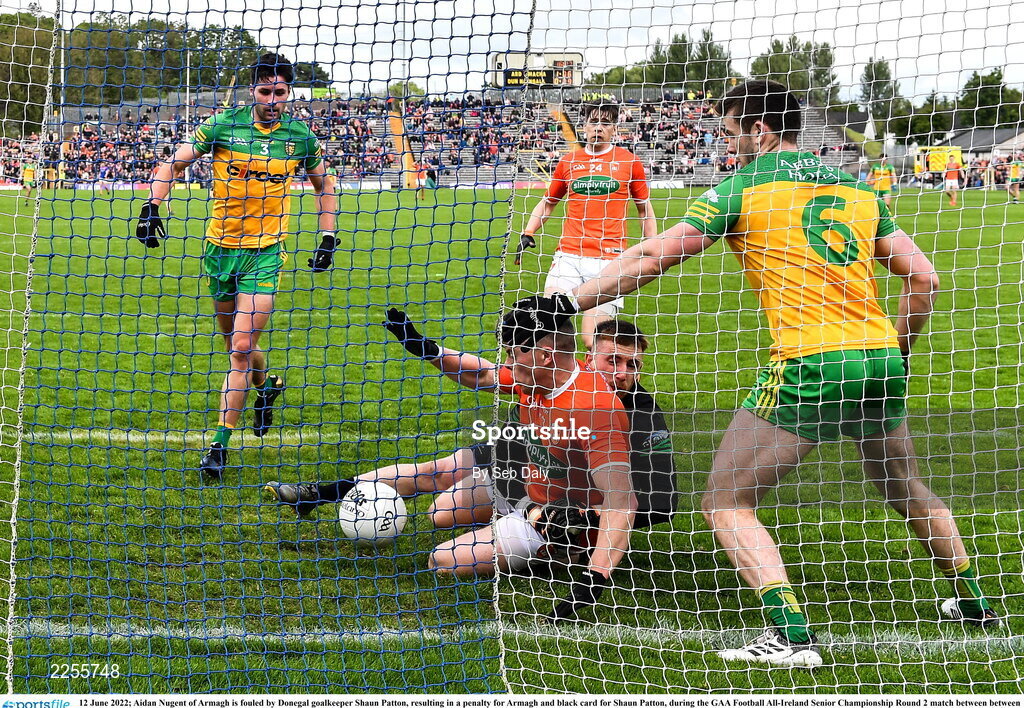 12 June 2022; Aidan Nugent of Armagh is fouled by Donegal goalkeeper Shaun Patton, resulting in a penalty for Armagh and black card for Shaun Patton, during the GAA Football All-Ireland Senior Championship Round 2 match between between Donegal and Armagh at St Tiernach's Park in Clones, Monaghan. Photo by Seb Daly/Sportsfile