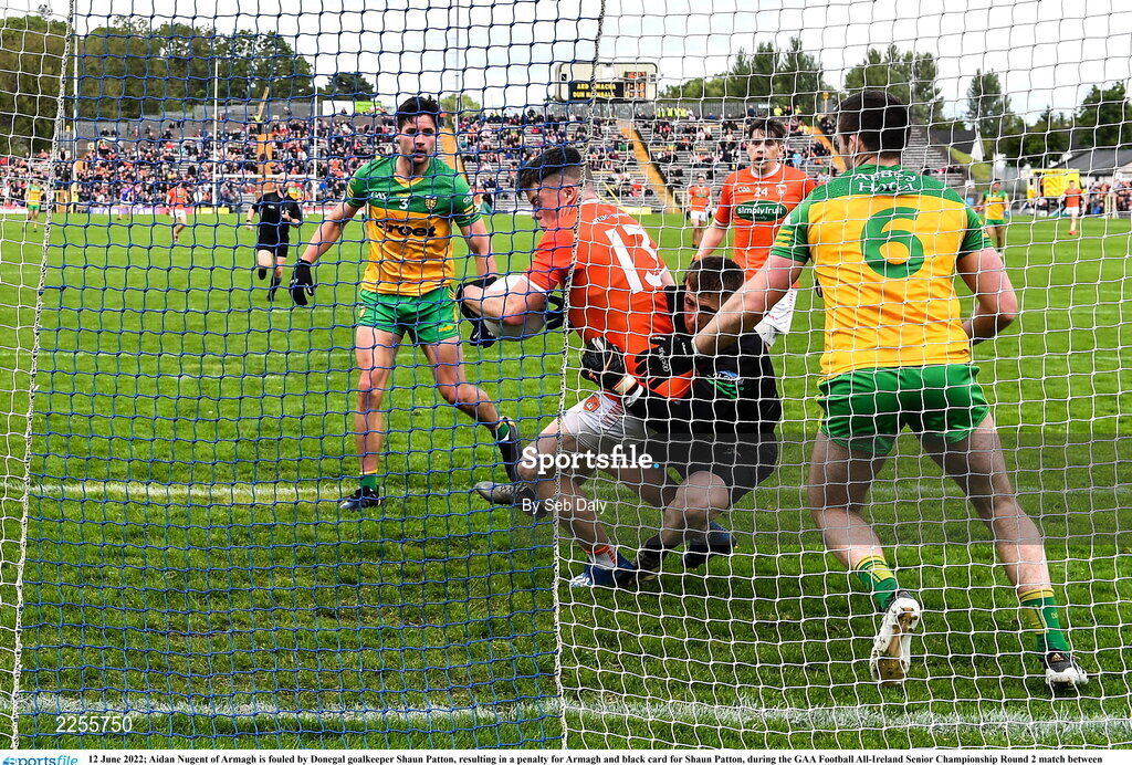 12 June 2022; Aidan Nugent of Armagh is fouled by Donegal goalkeeper Shaun Patton, resulting in a penalty for Armagh and black card for Shaun Patton, during the GAA Football All-Ireland Senior Championship Round 2 match between between Donegal and Armagh at St Tiernach's Park in Clones, Monaghan. Photo by Seb Daly/Sportsfile