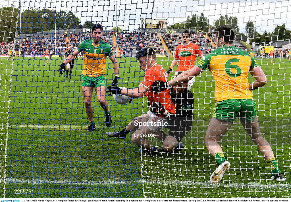 12 June 2022; Aidan Nugent of Armagh is fouled by Donegal goalkeeper Shaun Patton, resulting in a penalty for Armagh and black card for Shaun Patton, during the GAA Football All-Ireland Senior Championship Round 2 match between between Donegal and Armagh at St Tiernach's Park in Clones, Monaghan. Photo by Seb Daly/Sportsfile
