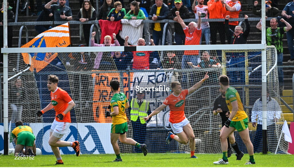 12 June 2022; Rian O'Neill of Armagh celebrates after scoring his side's second goal, from a penalty, during the GAA Football All-Ireland Senior Championship Round 2 match between between Donegal and Armagh at St Tiernach's Park in Clones, Monaghan. Photo by Ramsey Cardy/Sportsfile