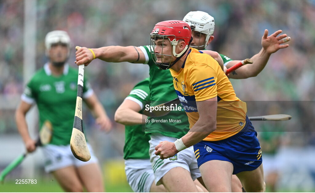 5 June 2022; Paul Flanagan of Clare in action against Aaron Gillane of Limerick during the Munster GAA Hurling Senior Championship Final match between Limerick and Clare at FBD Semple Stadium in Thurles, Tipperary. Photo by Brendan Moran/Sportsfile
