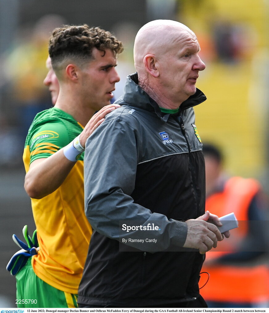 12 June 2022; Donegal manager Declan Bonner and Odhran McFadden Ferry of Donegal during the GAA Football All-Ireland Senior Championship Round 2 match between between Donegal and Armagh at St Tiernach's Park in Clones, Monaghan. Photo by Ramsey Cardy/Sportsfile