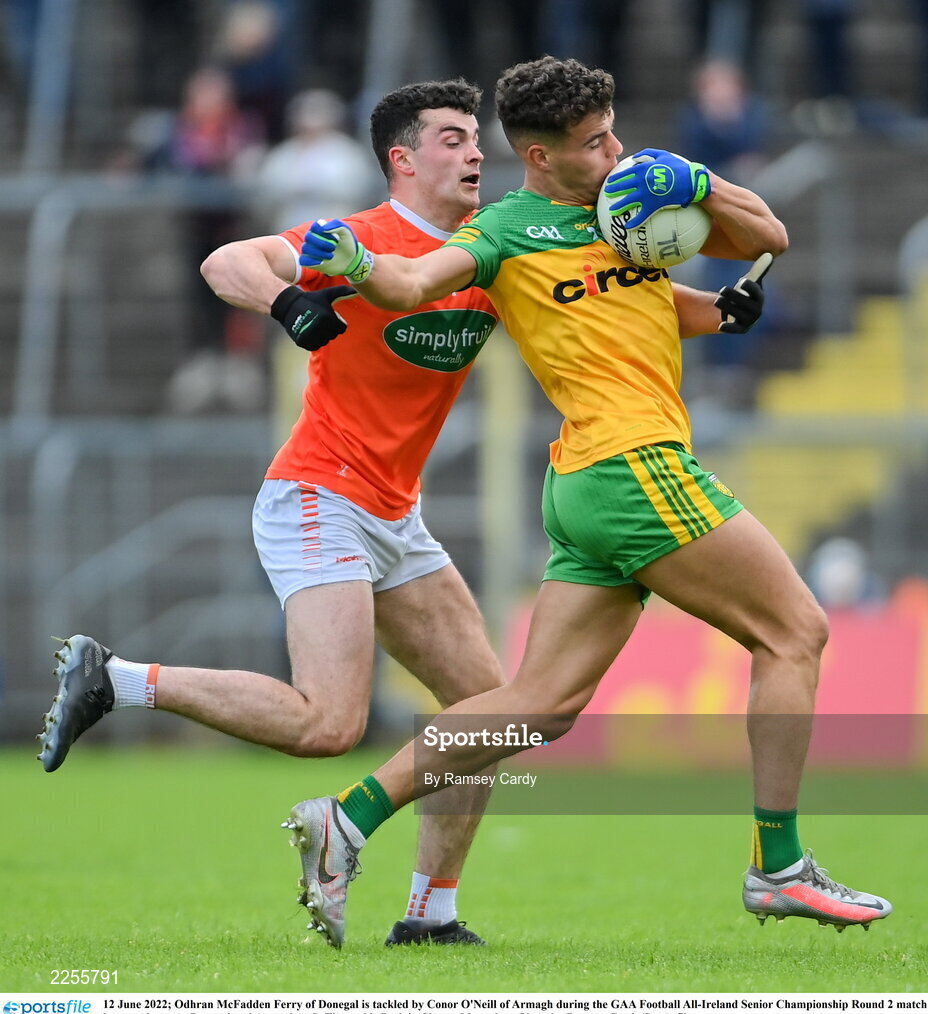 12 June 2022; Odhran McFadden Ferry of Donegal is tackled by Conor O'Neill of Armagh during the GAA Football All-Ireland Senior Championship Round 2 match between between Donegal and Armagh at St Tiernach's Park in Clones, Monaghan. Photo by Ramsey Cardy/Sportsfile