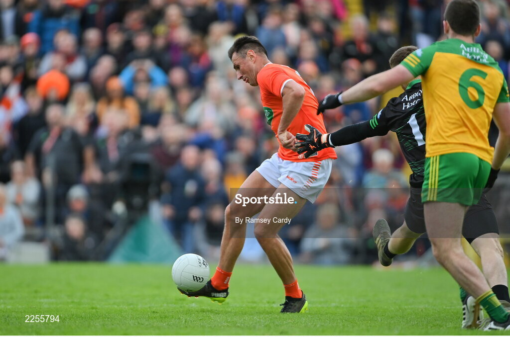 12 June 2022; Stephen Sheridan of Armagh scores his side's third goal during the GAA Football All-Ireland Senior Championship Round 2 match between between Donegal and Armagh at St Tiernach's Park in Clones, Monaghan. Photo by Ramsey Cardy/Sportsfile