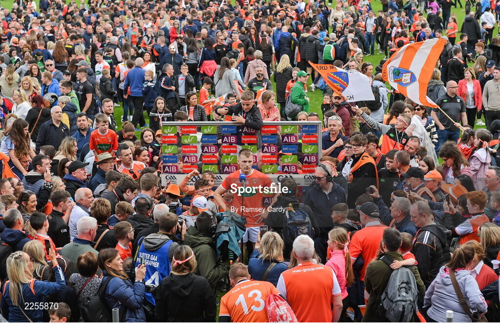 12 June 2022; Rian O'Neill of Armagh is interviewed by Damien O'Meara of RTE after the GAA Football All-Ireland Senior Championship Round 2 match between between Donegal and Armagh at St Tiernach's Park in Clones, Monaghan. Photo by Ramsey Cardy/Sportsfile