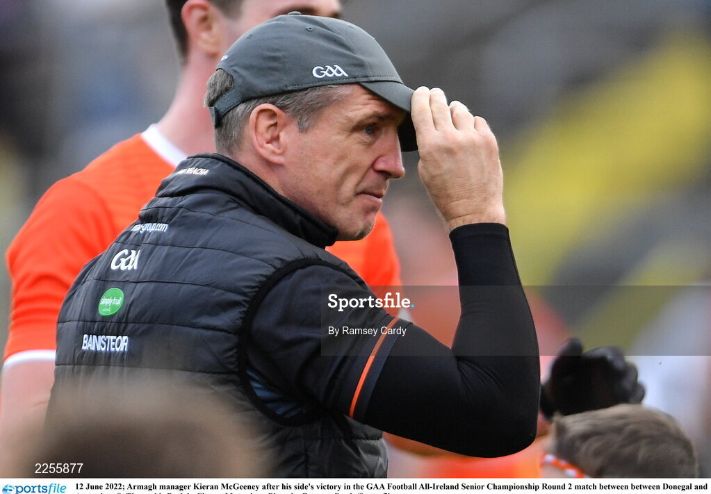 12 June 2022; Armagh manager Kieran McGeeney after his side's victory in the GAA Football All-Ireland Senior Championship Round 2 match between between Donegal and Armagh at St Tiernach's Park in Clones, Monaghan. Photo by Ramsey Cardy/Sportsfile