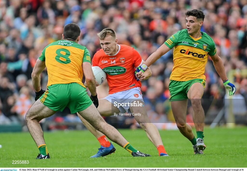 12 June 2022; Rian O'Neill of Armagh in action against Caolan McGonagle, left, and Odhran McFadden Ferry of Donegal during the GAA Football All-Ireland Senior Championship Round 2 match between between Donegal and Armagh at St Tiernach's Park in Clones, Monaghan. Photo by Ramsey Cardy/Sportsfile