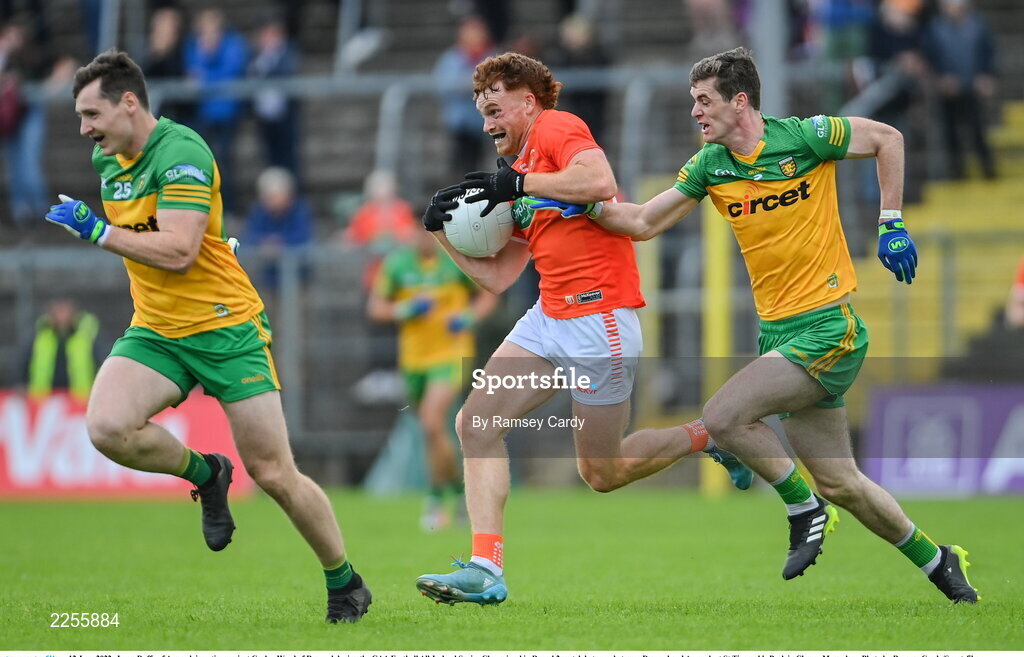 12 June 2022; Jason Duffy of Armagh in action against Caolan Ward of Donegal during the GAA Football All-Ireland Senior Championship Round 2 match between between Donegal and Armagh at St Tiernach's Park in Clones, Monaghan. Photo by Ramsey Cardy/Sportsfile