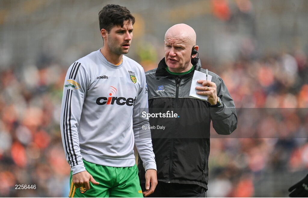 12 June 2022; Donegal manager Declan Bonner, right, with Brendan McCole before the GAA Football All-Ireland Senior Championship Round 2 match between between Donegal and Armagh at St Tiernach's Park in Clones, Monaghan. Photo by Seb Daly/Sportsfile