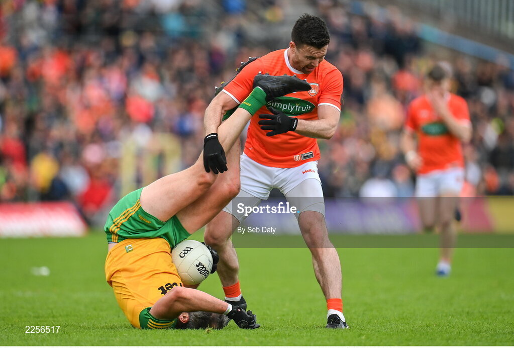12 June 2022; Michael Murphy of Donegal tussles with Aidan Forker of Armagh during the GAA Football All-Ireland Senior Championship Round 2 match between between Donegal and Armagh at St Tiernach's Park in Clones, Monaghan. Photo by Seb Daly/Sportsfile