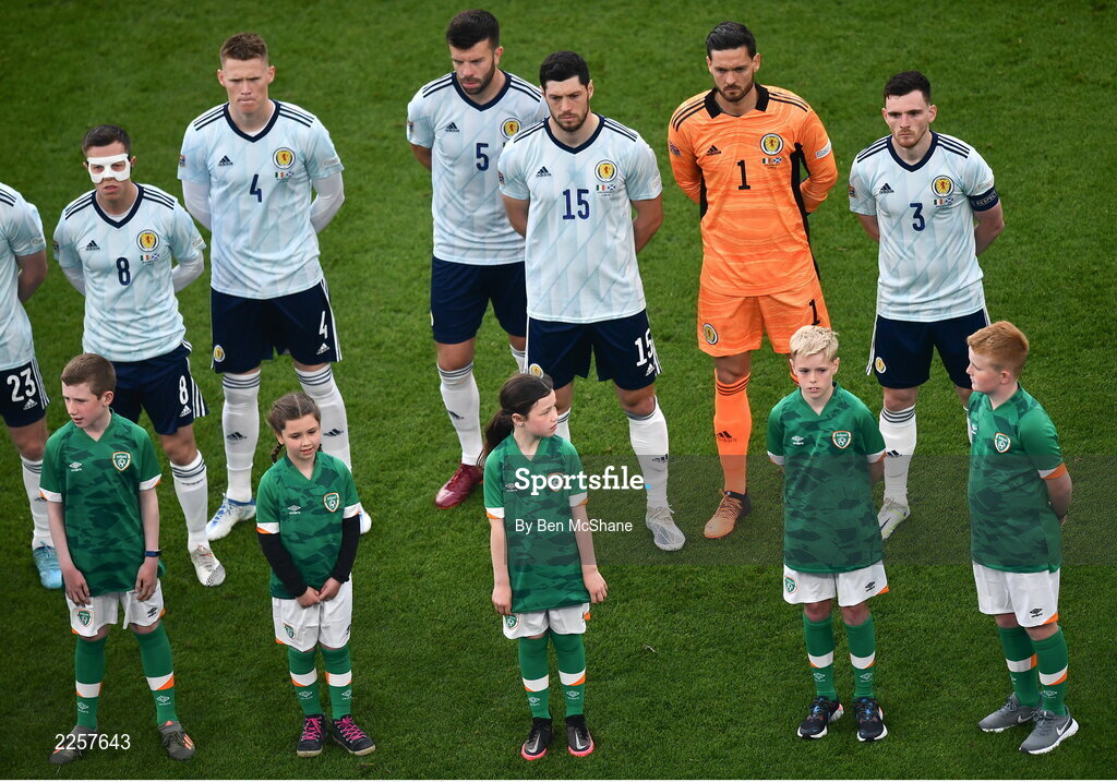 11 June 2022; Scotland players, from left, Callum McGregor, Scott McTominay, Grant Hanley, Scott McKenna, Craig Gordon and Andy Robertson before the UEFA Nations League B group 1 match between Republic of Ireland and Scotland at the Aviva Stadium in Dublin. Photo by Ben McShane/Sportsfile