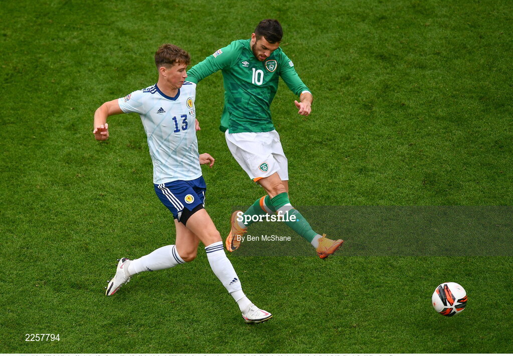 11 June 2022; Jack Hendry of Scotland and Troy Parrott of Republic of Ireland during the UEFA Nations League B group 1 match between Republic of Ireland and Scotland at the Aviva Stadium in Dublin. Photo by Ben McShane/Sportsfile