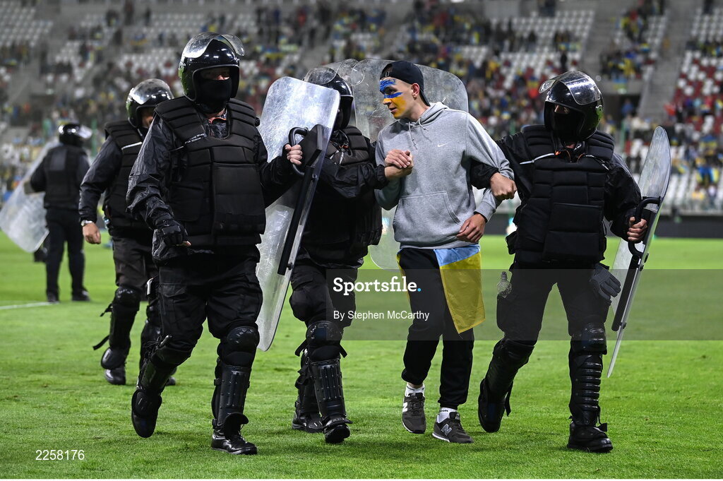 14 June 2022; A pitch invader is escorted from the pitch by Riot Police after the UEFA Nations League B group 1 match between Ukraine and Republic of Ireland at LKS Stadium in Lodz, Poland. Photo by Stephen McCarthy/Sportsfile