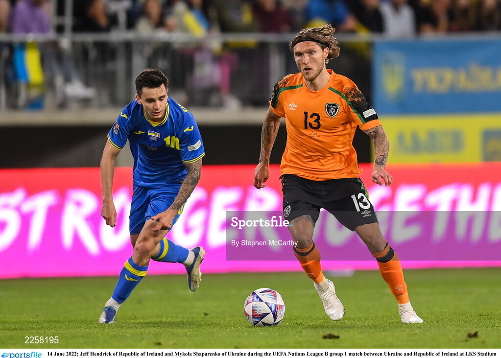 14 June 2022; Jeff Hendrick of Republic of Ireland and Mykola Shaparenko of Ukraine during the UEFA Nations League B group 1 match between Ukraine and Republic of Ireland at LKS Stadium in Lodz, Poland. Photo by Stephen McCarthy/Sportsfile