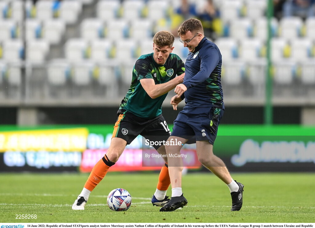 14 June 2022; Republic of Ireland STATSports analyst Andrew Morrissey assists Nathan Collins of Republic of Ireland in his warm-up before the UEFA Nations League B group 1 match between Ukraine and Republic of Ireland at LKS Stadium in Lodz, Poland. Photo by Stephen McCarthy/Sportsfile