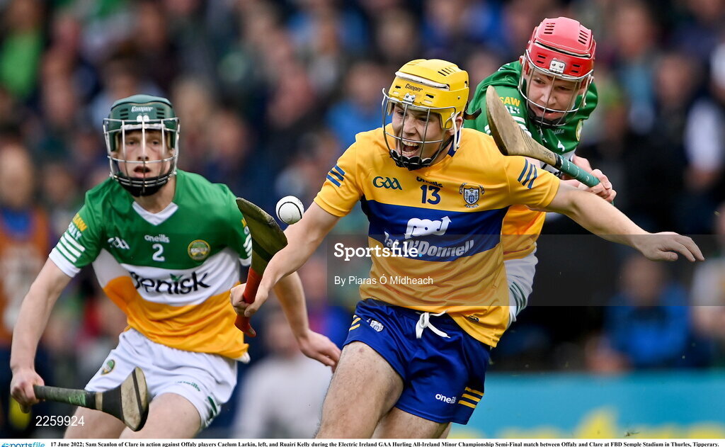 17 June 2022; Sam Scanlon of Clare in action against Offaly players Caelum Larkin, left, and Ruairí Kelly during the Electric Ireland GAA Hurling All-Ireland Minor Championship Semi-Final match between Offaly and Clare at FBD Semple Stadium in Thurles, Tipperary. Photo by Piaras Ó Mídheach/Sportsfile