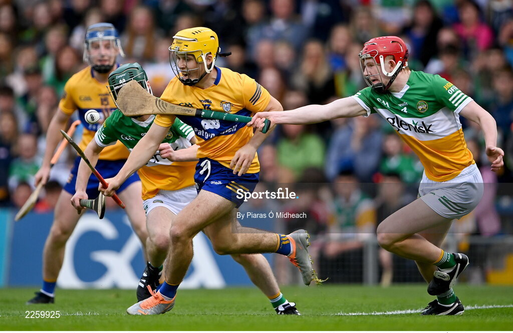 17 June 2022; Sam Scanlon of Clare in action against Offaly players Caelum Larkin, left, and Ruairí Kelly during the Electric Ireland GAA Hurling All-Ireland Minor Championship Semi-Final match between Offaly and Clare at FBD Semple Stadium in Thurles, Tipperary. Photo by Piaras Ó Mídheach/Sportsfile