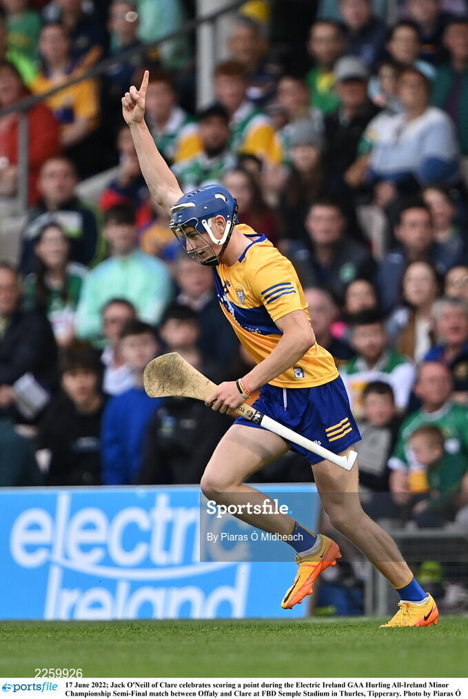 17 June 2022; Jack O'Neill of Clare celebrates scoring a point during the Electric Ireland GAA Hurling All-Ireland Minor Championship Semi-Final match between Offaly and Clare at FBD Semple Stadium in Thurles, Tipperary. Photo by Piaras Ó Mídheach/Sportsfile