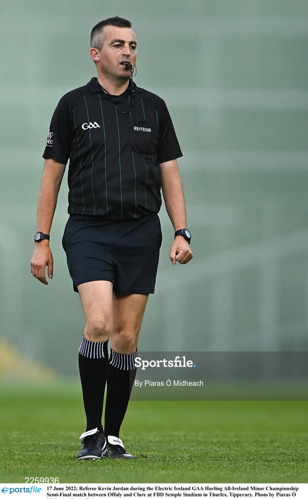 17 June 2022; Referee Kevin Jordan during the Electric Ireland GAA Hurling All-Ireland Minor Championship Semi-Final match between Offaly and Clare at FBD Semple Stadium in Thurles, Tipperary. Photo by Piaras Ó Mídheach/Sportsfile